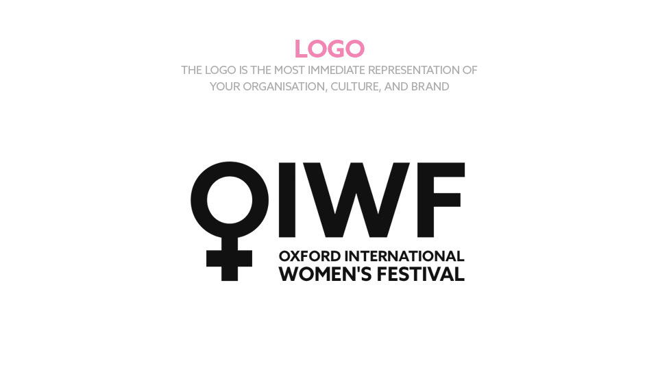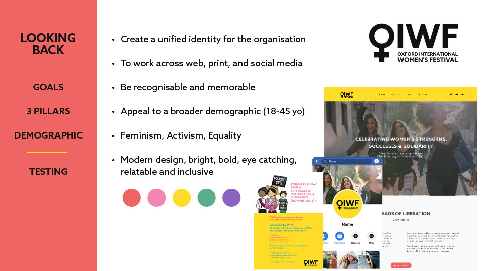 Below is the brand presentation pitched to the client, showcasing the brand goals, development and final assets. Thought was given to how the branding would work across different platforms and media, including print advertising and social media. As part of this branding work Oxford International Women's Festival was rebranded to OIWF.
